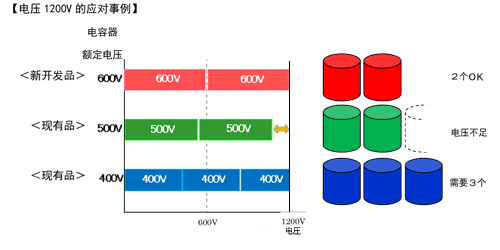 额定电压高于现有品,正在向大规模太阳能发电系统用电力调节器大力推介。由于电路电压高,因此多个铝电解电容器串联连接使用,然而通过使用“LGN系列”600V额定品,可减少件数。例如,对于电压1200V,400V品需要3个串联使用,但是新产品600V品只需2个串联即可应对,能够视省空间的电路设计。