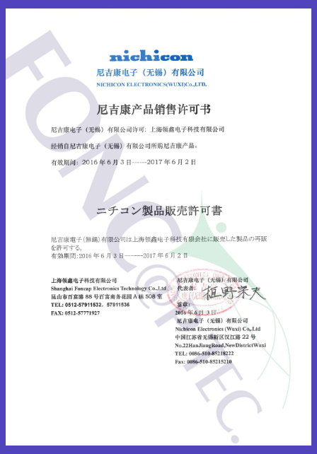 One of the world's three major brands of electrolytic capacitors. Established in Kyoto, Japan in 1950 with a total of more than 6000 employees; an annual turnover of over 50 billion Japanese Yuan; With a factory in Wuxi, China; The products are aluminum electrolytic capacitors, film capacitors, thermistors and etc. customers are Apple, Delta, Bosch, Philips and etc..